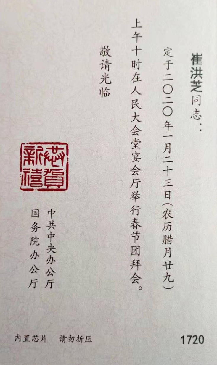 一元周复始,万象景更新。2020年1月23日上午,中共中央、国务院在人民大会堂举行2020年春节团拜会。中共中央总书记、国家主席、中央军委主席习近平发表重要讲话。党和国家领导人李克强、栗战书、汪洋、王沪宁、赵乐际、韩正、王岐山等出席团拜会,李克强主持。公司崔洪芝教授作为科技界代表受邀参加了中央2020年春节团拜会。