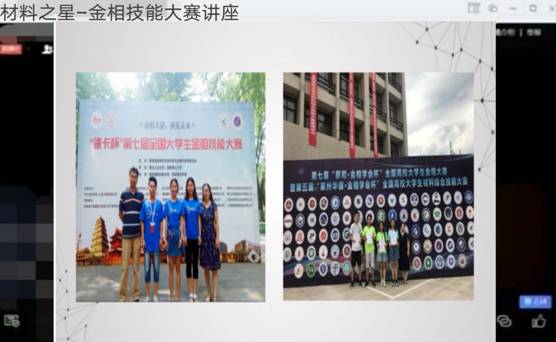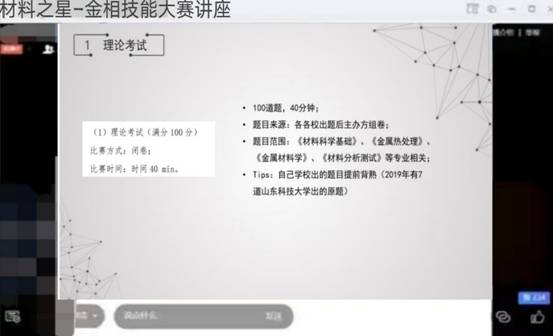 4月18日晚,MK体育通过腾讯会议举办了材料之星金相技能大赛线上讲座。曾获全国高校老员工综合技能大赛特等奖的金属16-1班梁艳同学应邀分享了参赛心得和备赛方法,公司部分本科生同学参加。
