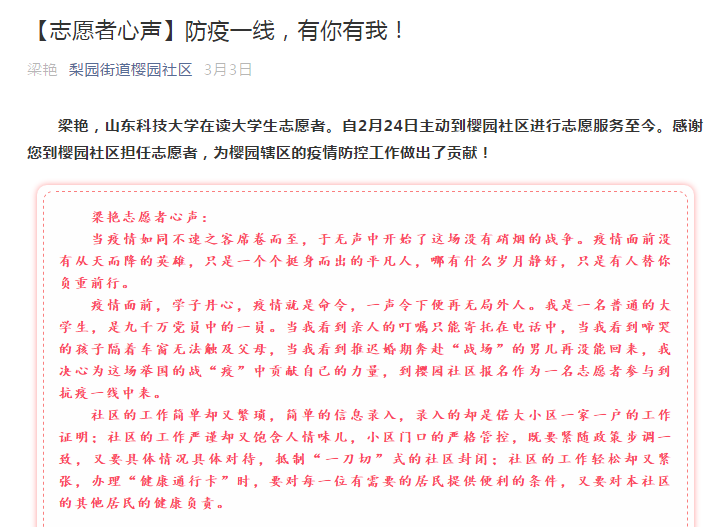 焦健,新能源2017级员工,家住泰安市泰山区三里小区。他通过新闻了解到全国各地的医护人员纷纷前往武汉等疫情严重地区进行驰援,内心很受触动。作为一名预备党员,他报名加入社区的志愿服务队,认真完成人员车辆出入登记、社区居民健康检查等工作,努力为疫情防控贡献自己的力量。其事迹被财源街道三里社区微信公众号报道。