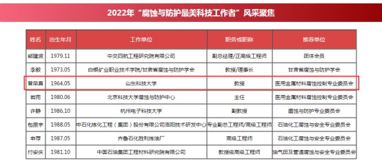 近日,中国腐蚀与防护学会下发决定,授予熊建波等8位同志2022年腐蚀与防护最美科技工作者称号。其中,公司曾荣昌教授获此殊荣。