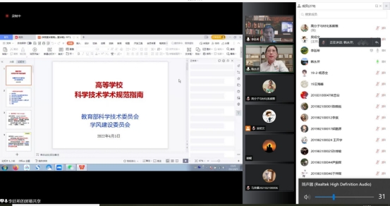 根据公司《关于开展科研诚信及学风建设教育月活动的通知》要求,4月5日下午,MK体育学术委员会主任李廷希教授以“坚守科研诚信、学术不端零容忍”为主题,在线上面向MK体育全体教师和研究生围绕《高等公司科学技术学术规范指南》作了专题报告,报告会由MK体育副经理韩永芹主持。
