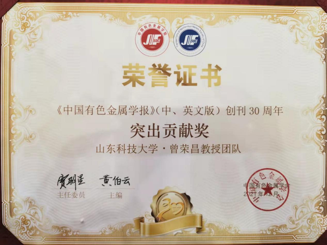 此外,课题组还获得了《中国有色金属学报》(中、英文版)创刊30周年 “我与《中国有色金属学报》(中英文版)”特约撰稿、《中国有色金属学报(英文版)》创刊30周年优秀审稿专家、《中国有色金属学报(英文版)》高影响力论文TOP100(2011-2020年)1篇、《中国有色金属学报(中文版)》高影响力论文TOP100(2011-2020年)1篇、《中国有色金属学报》创刊30周年征稿优秀论文等5项奖励。通过此次纪念大会,《中国有色金属学报》(中、英文版)编辑部对曾荣昌教授课题组所做的工作给予了高度肯定。