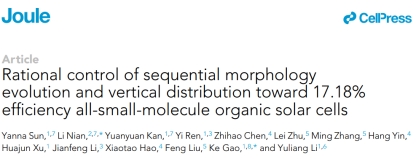 近日,从山东大学获悉公司员工高珂教授课题组在有机小分子太阳电池方面取得重要进展,设计合成新型固体添加剂甲氧基石墨炔,并采用逐层加工工艺,协同调控小分子太阳电池垂直相分离与材料结晶,研究证明甲氧基石墨炔在调控和优化微纳结构方面的独特优势,实现了目前小分子太阳电池世界最高光电转换效率纪录(认证效率达17.08%),为小分子太阳电池的发展提供重要的指导意义。相关研究成果以“Rational Control of Sequential Morphology Evolution and Vertical Distribution towards 17.18% Efficiency All-Small-Molecule Organic Solar Cells”为题发表在国际顶尖期刊Joule上。