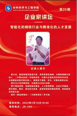 3月10日下午,公司举办第25期企业家讲坛,精益管理实践派代表,资深管理咨询师、五略管理模式创始人、《中国冶金报》专家库成员、中国大住宿业论坛特约评论员,永锋精益实践公司负责人董立杰应邀在J9-144会议室进行以《智能化的钢铁行业与精准化的人才发展》为题的报告。报告由MK体育经理李辉平主持,金属系主任孙金全、22级金属系全体本科生共计130余人参加。