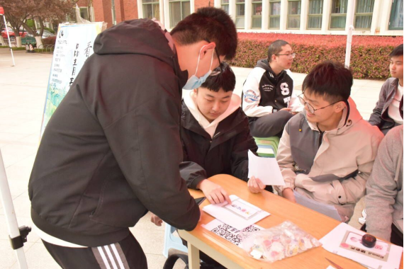 活动分为“春日文豪”和“镜间藏春”两个环节。同学们首先前往繁星广场领取勋章和镂空纸板参加看图猜词游戏,在规定时间内拍摄一组校园春光美景照片并提交,完成后由评委对作品进行打分,评选出一个一等奖、三个二等奖、五个三等奖并颁发证书。