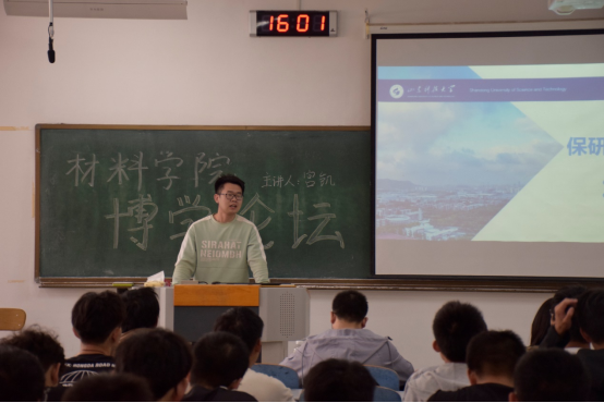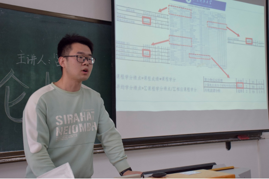 为了让同学们更好地了解保研及其相关问题,宫凯分别从学分绩点、特殊专长、发展素质三个方面来介绍综测分数的构成。他强调了学习成绩的重要性、挂科的严重后果以及全方面发展的重要性。随后,宫凯结合亲身经历,帮助在场同学更加清楚了自己对于保研与考研的选择,为在场同学树立了良好的榜样。最后,宫凯发出号召,希望同学们可以超越自我、勇攀高峰。