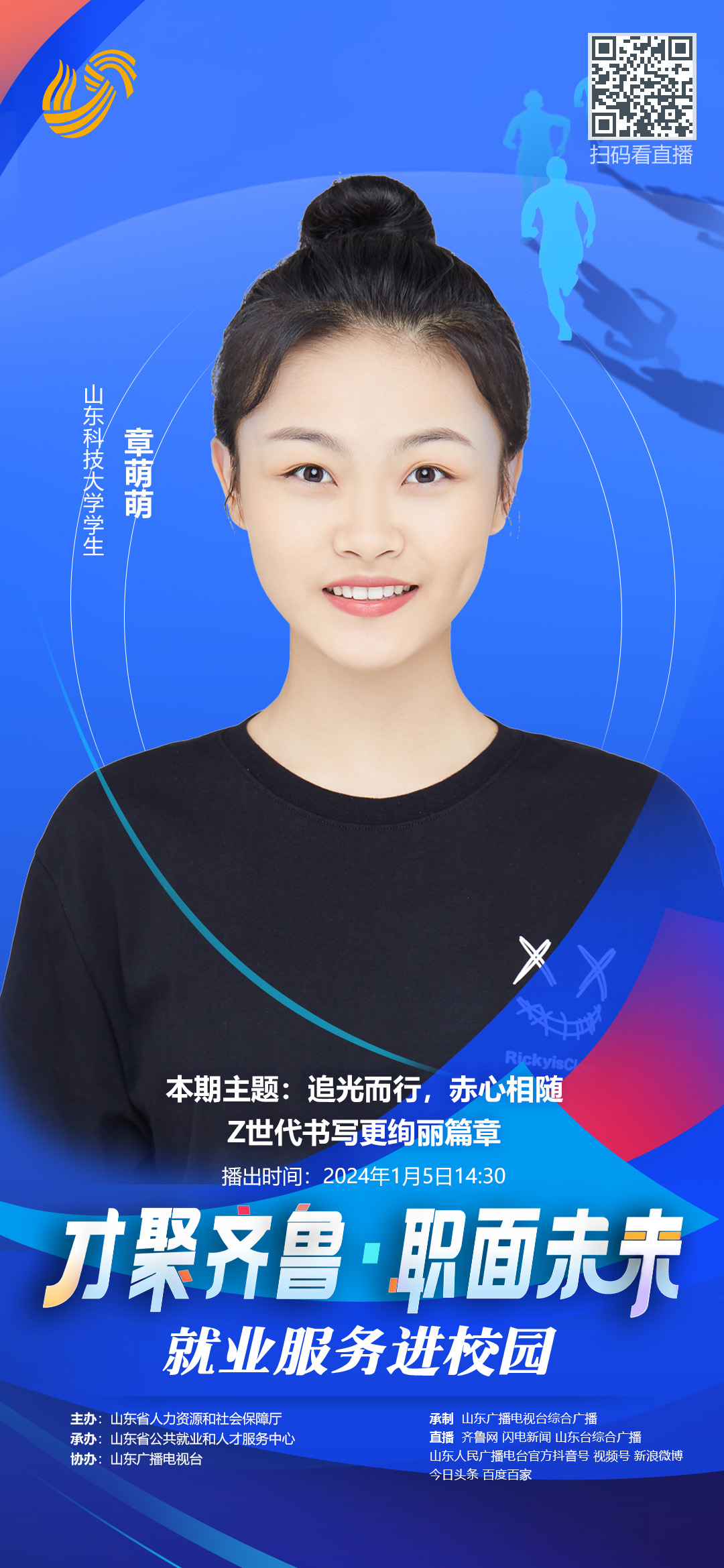 由山东省人力资源和社会保障厅主办、山东省公共就业和人才服务中心承办、山东广播电视台协办的“才聚齐鲁•职面未来”公益就业指导直播课将于1月5日14:30播出。公司新能源材料与器件专业2024届毕业生章萌萌受邀做客直播间,进行“追光而行,赤心相随——Z世代书写更绚丽篇章”主题分享。这次直播课将深入探讨在职场中面临的挑战,以及如何勇敢迎接未知。章萌萌将分享她和身边朋友们在求职、成长过程中的心得,与您共同思考在竞争激烈的现实中如何闪耀光芒,书写自己的职业传奇。