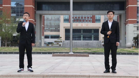 早晨6:20,升旗仪式正式开始。国旗护卫队队员迈着铿锵有力的步伐,护送五星红旗走向升旗台。在洪亮的国歌声中,展旗手将五星红旗奋力抛向天空。全体师生在冉冉升起的红旗下庄严肃立,向国旗行注目礼。接着,员工代表李华峰和李明泽在国旗下激情朗诵《我们的青春》,以跨时代对话的形式向我们展示了属于不同时代青年人的奋斗与担当。他们的朗诵让同学们认识到应以实际行动回报、奉献社会,以美好青春为底色,将伟大民族复兴当作心中蓝图,紧跟党走,不负青春韶华,勇担时代使命。