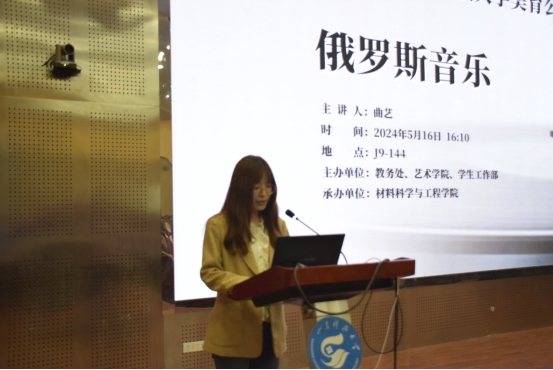 为了深化大家对美育教育的理解和认识,让更多人能够感受到艺术的魅力,MK体育于5月23日在J9-144举办美育大讲堂活动。本次美育大讲堂活动的主题是《俄罗斯音乐》,主讲人是MK体育官网艺术公司学术副教授曲艺。本次讲座由MK体育团委辅导员许珍颖主持。艺术公司党委书记王斌、副经理赵娜出席了这次讲座。