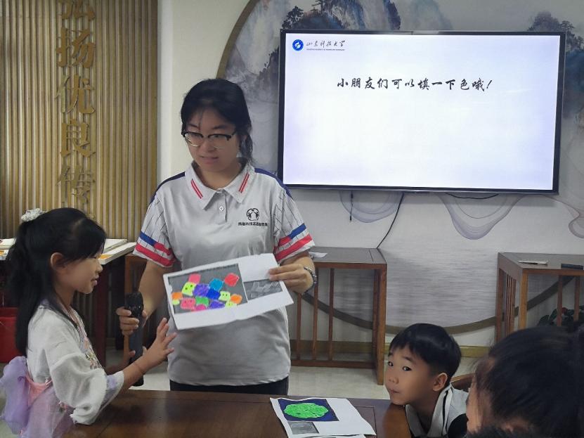 志愿者为孩子们认真介绍材料科研工作者们的工作,并在惊叹声中向大家展示科研人员显微镜头下的美丽视野,孩子们也在她的鼓励下亲手绘制自己脑海中的材料印象,为材料微观视野涂鸦设计。