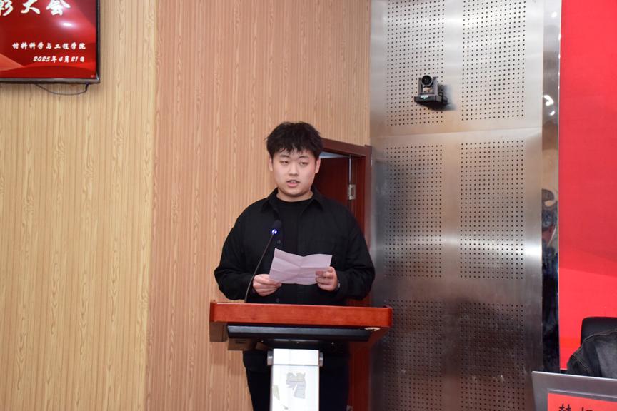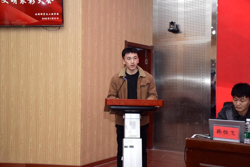 辅导员王瀚琨老师宣读了《员工公寓安全卫生日常通报实施办法(试行)》。金属24-4班宋佳龙作为基础文明优秀班集体代表,分享了班级在文明建设中的经验与成果,强调了班级凝聚力和集体荣誉感的重要性。A16-328宿舍王慕容代表优秀宿舍发言,讲述了宿舍成员共同营造文明和谐环境的故事。