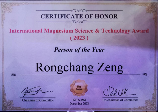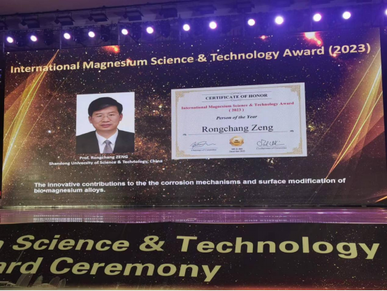 2023年12月11日-12日,2023年度国际镁科学技术奖颁奖典礼暨《镁合金学报(英文)》创刊十周年前沿论坛在河南省鹤壁市顺利召开。本次颁奖典礼由国际镁学会(International Mg Society)和《镁合金学报(英文)》(Journal of Magnesium and Alloys)共同主办。公司曾荣昌教授受邀参加此次颁奖典礼并获得2023年度人物奖。同时获得该奖项的还有美国加州大学圣巴巴拉分校机械工程公司Irene J. Beyerlein教授、河北工业大学副董事长王慧远教授和德国亥姆霍兹Hereon研究中心表面科学研究所所长Mikhail Zheludkevich教授。此奖的获得是组委会对曾荣昌教授在医用镁合金腐蚀机制和表面改性领域相关工作的高度认可。