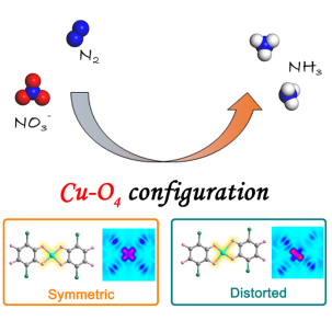单原子催化剂由于近乎100%的原子利用率和极高的稳定性在催化领域受到了广泛关注。一直以来对称型的M-X4 (M = Fe, Co, Cu;X= C, N, O)构型被认为是理想的单原子催化剂结构。然而,近期部分理论研究结果表明这种对称的电子分布状态可能不利于部分中间产物的活化,从而影响其催化活性。鉴于此,研究团队通过利用配位聚合物材料结构高度可调的特点,以氯冉酸分子(CA)为构筑单元与Cu配位,形成了富含Cu-O4构型的链状结构。由于相邻链的Cl与Cu之间存在较强的相互作用,使得Cu-O4构型发生了显著的局域结构畸变。进一步的理论计算结果表明,这种畸变的Cu-O4构型可以显著降低氮还原反应(NRR)和硝酸根还原反应(NO3RR)过程中中间产物的(*N2和*NO)的吸附与活化能垒,从而显著提升其催化性能。与此对应的,在相邻链之间植入辅助配体(吡嗪)会削弱Cu-O4构型的畸变程度,从而降低其催化活性。这种通过引入局域畸变调节活性中心电子构型的策略,可以为高效电催化剂的设计合成提供新的途径。