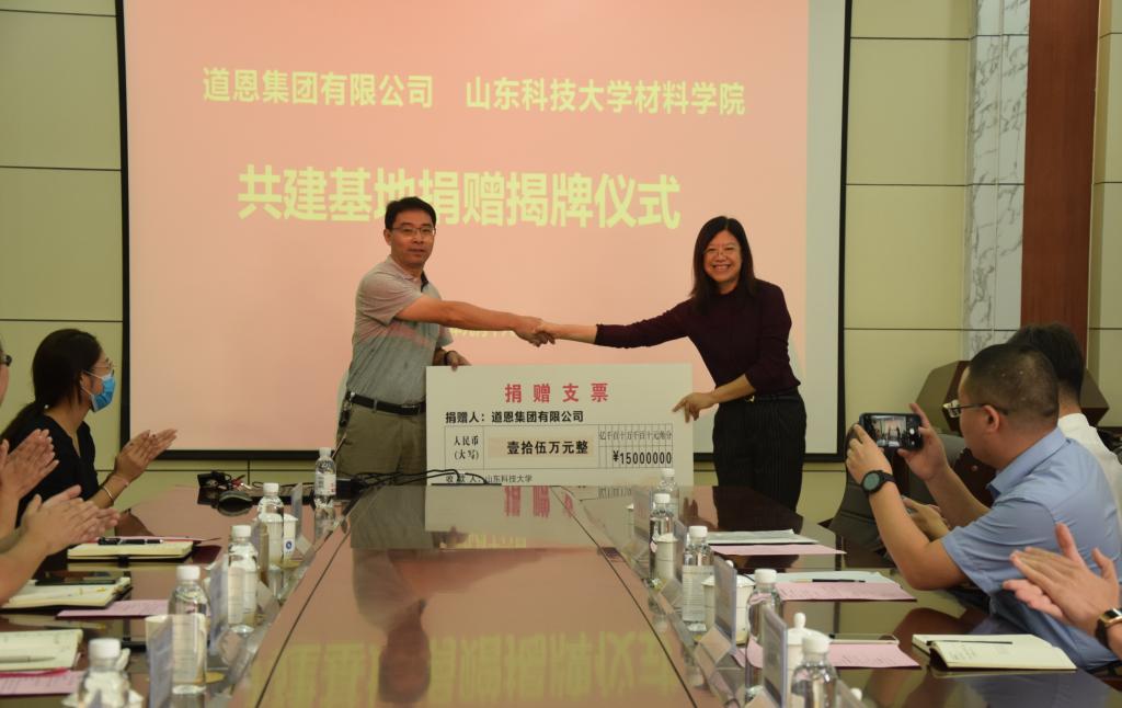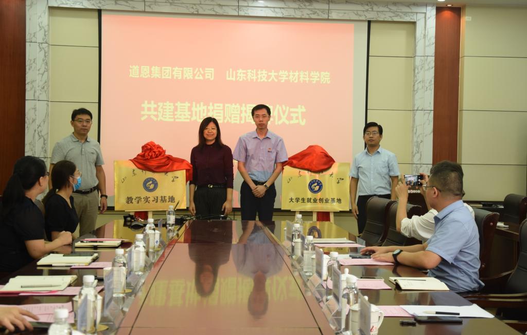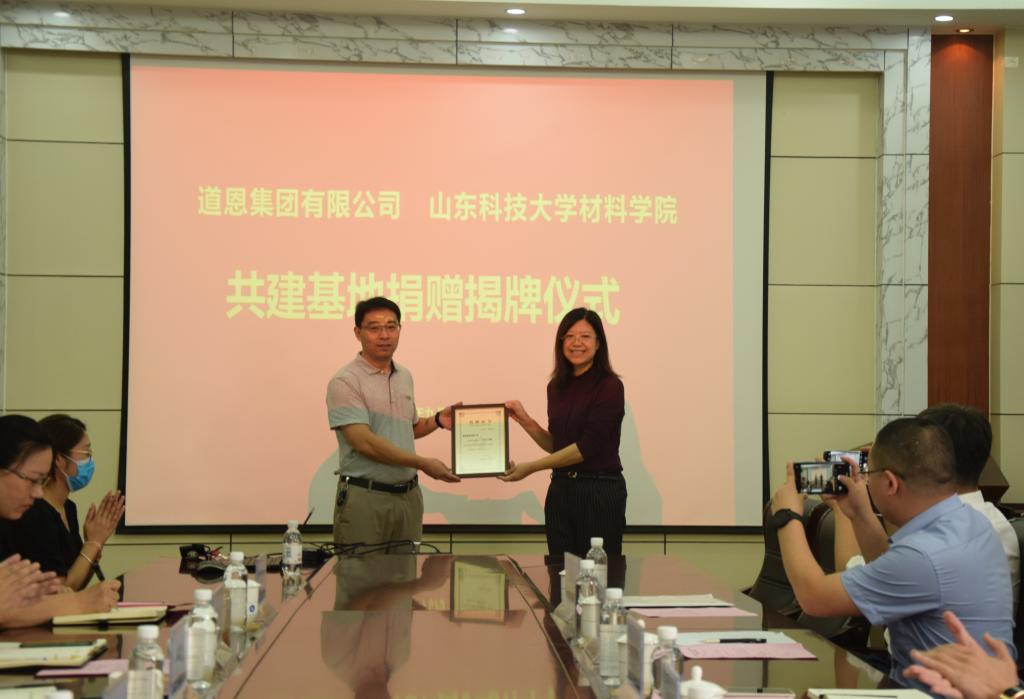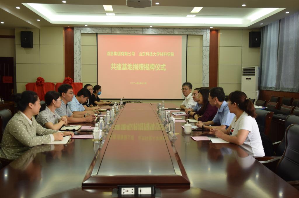 9月16日,MK体育与道恩集团有限公司在J2-434会议室举行了共建“MK体育官网教学实习基地”、“MK体育官网老员工就业创业基地”揭牌仪式暨道恩集团有限公司捐赠仪式。道恩集团人力总监刘丽丽、人力资源部副部长战福东、招聘经理陈健、道恩高分子材料有限公司研发总监王红、道恩青岛新材料公司研发总监张秀文,公司党委书记申兆亮、党委副书记兼副经理李建楠、学术副经理韩永芹、团委书记马韶霞、辅导员薄艳艳出席仪式。仪式由韩永芹主持。